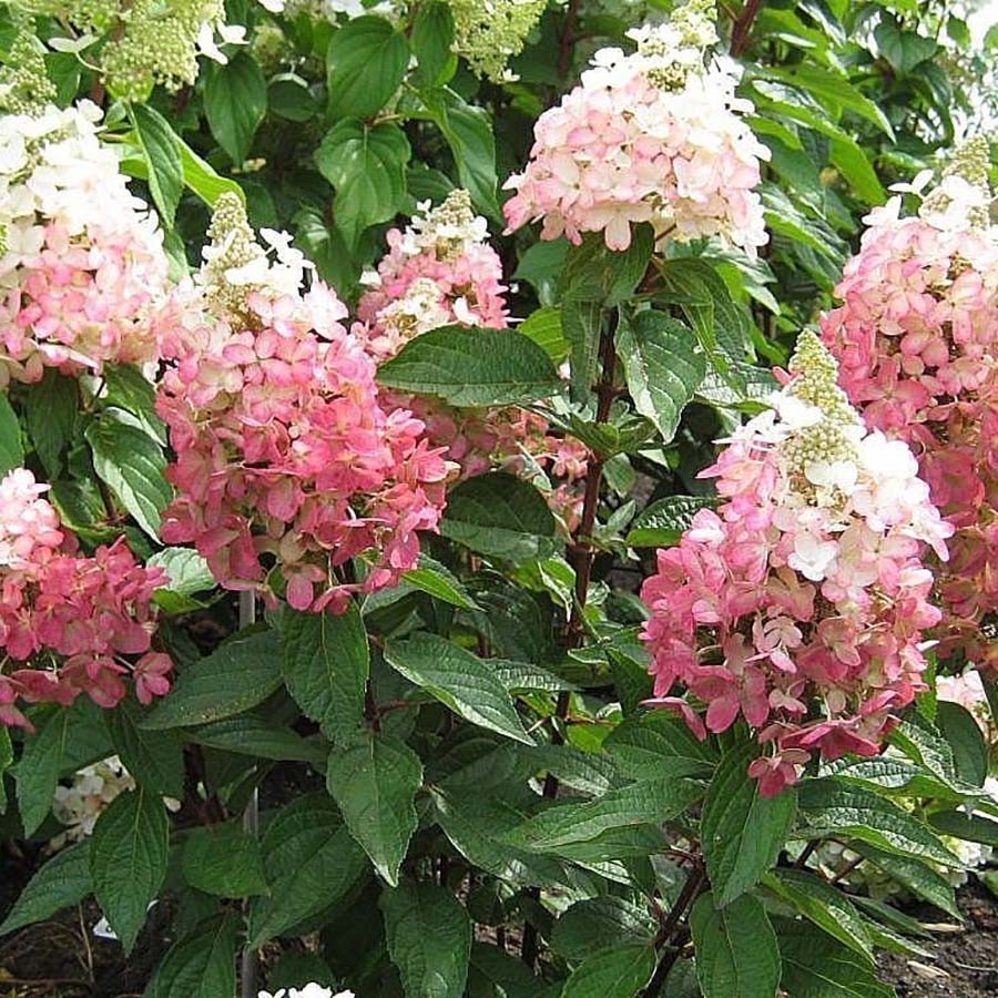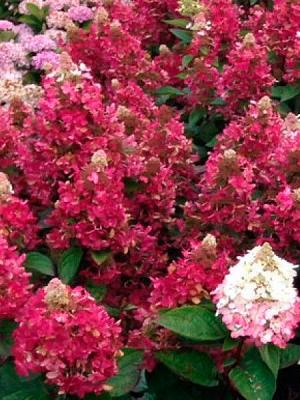 Гортензия метельчатая Magical Vesuvio (Мэджикал Везувио) цветки крупные, вначале белые, затем быстро меняют окраску на розовую и в конце цветения краснеют. Соцветия очень декоративные. Цветёт обильно на побегах текущего года в июле-сентябре. Побеги красно-коричневые жёсткие, не требуют опоры. Куст красивый, высотой и шириной 100-150 см. Место солнечное или полутенистое. Почва плодородная, кислая, влажная, дренированная. Посадка гортензии: Для метельчатой гортензии на начальном этапе важно создать благоприятные условия произрастания. Гортензиевые предпочитают кислый грунт. Грунты с песком или известняком не подходят. Хорошо добавить к садовому грунту хвойный опад, верховой торф или опилки, а почву вокруг растения замульчировать сосновой корой. Гортензии сажают в слегка влажную плодородную почву с добавлением торфа. Необходимо выкопать яму 40 – 50 см глубиной и 40 см в диаметре. Добавьте при посадке в лунку хвойный опад. Это создаст дополнительные хорошие условия для развития корней, а так же добавит более насыщенный розовый оттенок соцветиям. Приготовленный саженец нужно поставить в центр посадочной ямы так, чтобы его корневая шейка не была сильно заглублена. Вокруг растение следует тщательно засыпать почвой и утрамбовать, чтобы корни были хорошо прижаты и около них не образовалось пустоты.Уход за гортензией: Уход за гортензией сводится прежде всего к правильному поливу, своевременной подкормке, обрезке и рыхлению. Если делать все правильно, то кусты будут пышными, а соцветия крупными и яркими. В засушливый период кустарник надо очень тщательно поливать. Сохранить влагу поможет мульчирование. Гортензия очень обильно и продолжительно цветет, а значит, требует хорошей подкормки. Весной и осенью гортензию подкармливают комплексными минеральными удобрениями. Вносить удобрения рекомендуется в конце мая – начале июня, тогда когда гортензия тронется в рост. В более ранних подкормках нет смысла. Хорошо сработает азотсодержащее удобрение, но обязательно с подкислением: квасцы, тот же хвойный опад, уксус в слабых пропорциях. Второй раз гортензию можно подкормить перед самым началом цветения. Гортензии метельчатой обязательно требуется обрезка. Так кустарник будет хорошо себя чувствовать и выглядеть декоративно все лето и многие годы. Если не проводить регулярную обрезку (осенью, весной и летом) куст будет слишком раскидистый с обилием зеленой листвы, а соцветия не такие пышные и крупные.Почва для посадки: Почва для гортензии должна быть хорошо дренированной и увлажненной, состоять из сбалансированной смеси перегноя, листовой земли, торфяной крошки, речного песка (2:2:1:1). Вне зависимости от вида и сорта гортензии, помните, известь в почве отрицательно сказывается на развитии.Подготовка к зиме: раскидистые кусты гортензию на зиму желательно связывать. Иначе тяжелый снег может разломать хрупкие побеги. Укрытия метельчатая гортензия не требует. Гортензия метельчатая – достаточно морозостойкий вид, в укрытии на зиму не нуждается. Стоит укрывать лишь молодые растения первых лет жизни, да и то будет достаточно мульчирования листвой.Место для посадки: И хотя встречаются рекомендации, что гортензия теневынослива, роскошное цветение можно получить только на открытом солнечном участке. В тени гортензия даст слабые побеги и слабые цветоносы