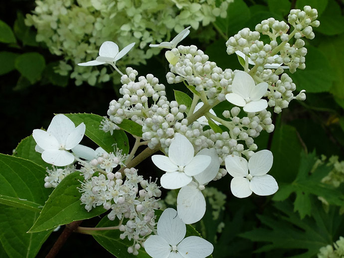 Кустарник с густой раскидистой веерообразной кроной. Среди мелких репродуктивных цветков разбросаны задорные крупные стерильные цветочки. В период распускания бутоны имеют кремовый оттенок, в момент цветения– белый, осенью – розовый. Любит полутень и защищенный от ветра участок. Сорт Kyushu считается хорошим медоносом, обладает приятным ароматом. Высота: 3 м. Соцветия пирамидальные, крупные, длиной 20-35 см. Цветение: июнь-октябрь. Морозостойкость: -34°С, зона 4.