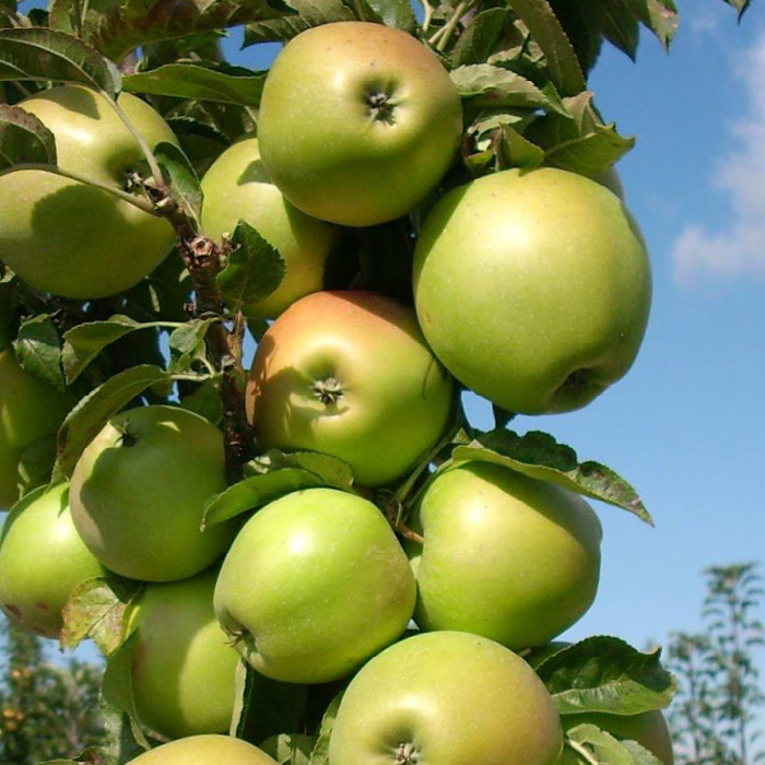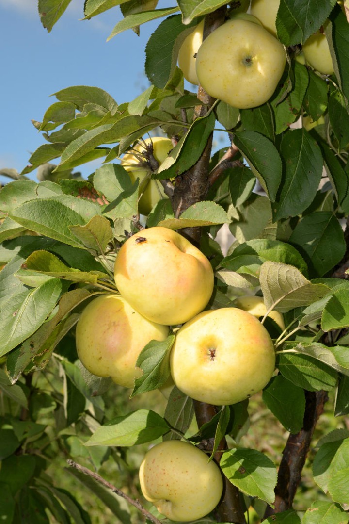 Невысокое дерево даёт красивые плоды желтоватого цвета, очень приятные на вкус — сладкие и ароматные. Сорт позднелетнего срока созревания (конец лета — начало осени). Урожай хранится недолго — в течение месяца, но великолепно подходит для консервации и изготовления сухофруктов.Медок отличается ранним плодоношением — уже на 2-й год после посадки можно собирать урожай. Цветение может начаться и сразу после весенней высадки в сад, однако, чтобы не ослабить растение, цветки следует оборвать. Одно из достоинств сорта — морозостойкость: дерево выдерживает понижение температуры до -42°C, поэтому рекомендовано для выращивания в средней полосе России, Сибири и на Урале. Даже в условиях короткого северного лета плоды успевают вызреть и набраться медовой сладости.Полукарликовый сорт достигает в высоту 2–2,2 м. Дерево колоновидной формы с компактной кроной шириной 20–25 см. Плоды округлой формы, среднего и крупного размера, средней массой 100 г, при выращивании в благоприятных условиях становятся более крупными, до 250 г. Плотная кожица бело-жёлтого цвета. Сочная мякоть крупнозернистая, белого цвета, сладкая, с ярко выраженным медовым привкусом. Максимальный урожай — 9 кг плодов можно получить с 5-летней яблони. Опытные фермеры с гектара собирают до 100 т яблок. С возрастом продуктивность постепенно снижается. Срок жизни дерева — до 50 лет, но плодоносит оно только в течение 15 лет. Омолодить старую колоновидную яблоню с помощью обрезки, как обычные плодовые деревья, нельзя, поэтому посадки обновляют. Устойчивость к вредителям и болезням на уровне стандартных сортов.