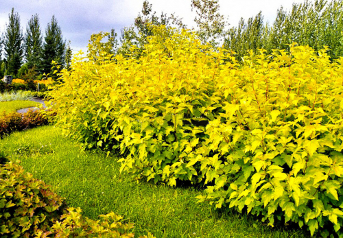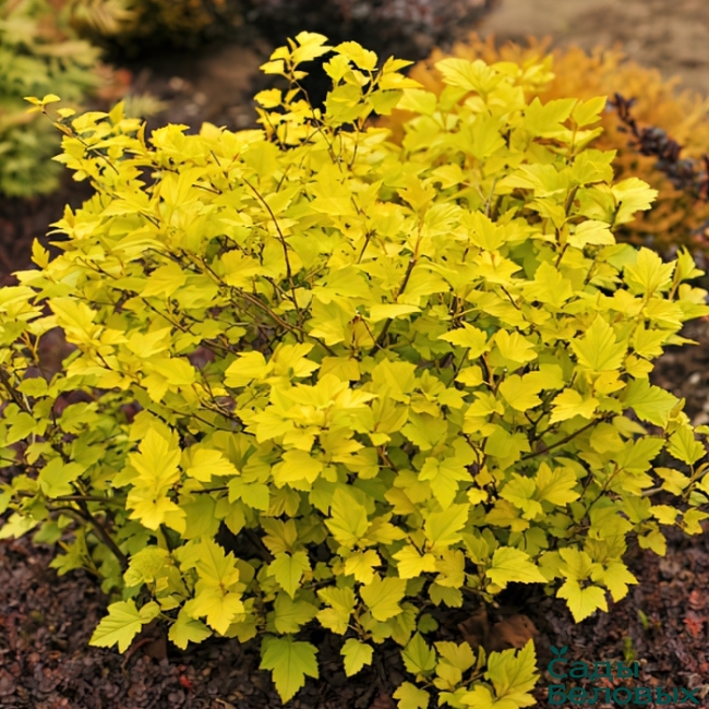 Пузыреплодник калинолистный Ангел Голд (Angel Gold) – новая декоративная форма пузыреплодника с «золотой» листвой, выведенная французскими селекционерами в 2008 году. Ангел Голд отлично приукрасит Ваш любимый сад!Пузыреплодник Ангел Голд – плотный куст с многочисленными вертикальными, слегка раскидистыми побегами, образующими густую, округлую крону высотой и шириной 2,0– 2,5м. Темп прироста быстрый, около 30 см за сезон.У Ангел Голд листья 3–5–лопастные, до 7 см, гофрированные по жилкам, вытянутые, яркие, лимонно–желтого оттенка. В центре куста – желто–зелены, а осенью золотистые. Цветы многочисленные, белые, собраны в щитовидные соцветия, размером до 5 см. Плоды – вздутые листовки, бурые, созревают в сентябре. Цветёт в июне–июле.Оригинально смотрится пузыреплодник Ангел Голд, посаженный сольно на изумрудном газоне. Его часто используют при создании живых изгородей. Эффектно выглядит микс из двух разных цветов, посаженных поочерёдно. С помощью пузыреплодника Angel Gold можно создать впечатляющие ландшафтные композиции в цветниках, альпинариях, миксбордерах, у водоемов, среди камней.Высаживать пузыреплодник Angel Gold лучше на солнечных пространствах, но он будет развиваться и в полутени, и в тени. Но свою яркую окраску сохранит только на солнечных местах, в тенистых листва зеленеет. Растет на любых, в меру увлажненных почвах и хорошо дренированных. Уход за Ангел Голд заключается в периодических поливах, подкормках, рыхлении почвы, формирующей обрезке и в обрезке старых побегов. Рекомендуется удалять появляющиеся реверсивные зеленые ветви. Морозостоек. Устойчив к болезням и вредителям.