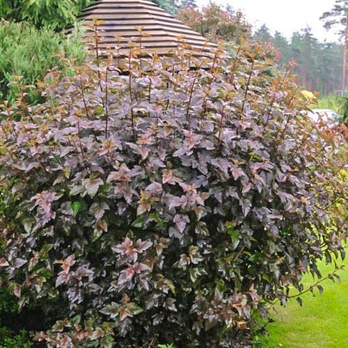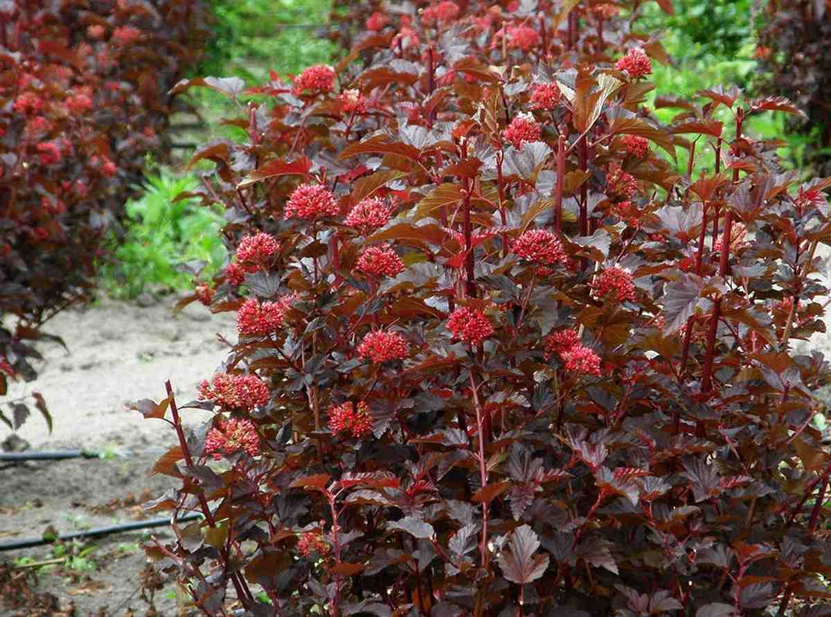 Пузыреплодник калинолистный Ред Барон – роскошный кустарник, его достаточно часто используют в сложных садовых композициях, где он может солировать, а также являться прекрасным фоном для других цветов.Пузыреплодник Red Baron – раскидистый, активно разрастающийся кустарник до 2м высотой и таким же диаметром. Растет вверх, позже ветви дугообразно изгибаются, имеет густую шарообразную крону.Листья у Ред Барон 3–5 лопастные, овальные, длиной до 7 см, зубчатые, темно–красные, а осенью приобретают бронзовый оттенок. Цветки бело–розовые, собранные в щитковидные соцветия диаметром до 5 см, которые очень эффектно смотрятся на фоне темной листвы. Бурые плоды созревают в августе – сентябре, представляют собой вздутые листовки. Цветет в июне–июле.Ред Барон широко используется в одиночных и групповых посадках для опушек, куртин, древесно–кустарниковых и кустарниковых групп, композиций с хвойными и травянистыми растениями. Из него получаются шикарные, плотные живые изгороди, которые становятся настоящим украшением любого сада, дачного участка или какой–либо зоны отдыха.Red Baron нетребователен к почве, хорошо и быстро растет на солнце и в тени. В тени листва зеленеет, а на солнце становится ярче. Нечувствителен к загрязнению и сильным ветрам. Основными этапами ухода являются полив, подкормка и санитарная обрезка. Зимостоек, но молодые побеги могут подмерзать и легко восстанавливаться весной.