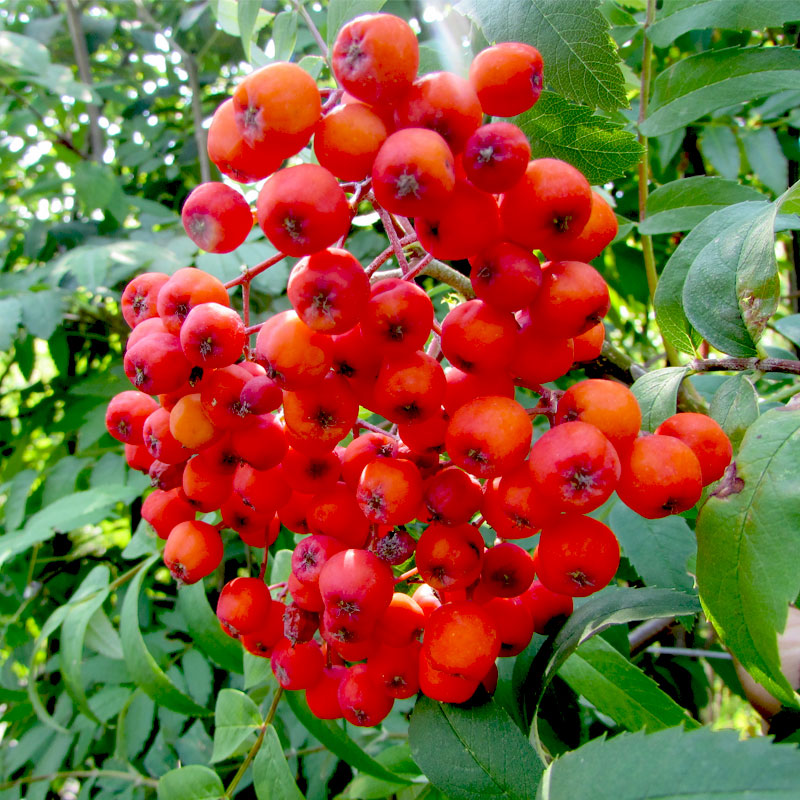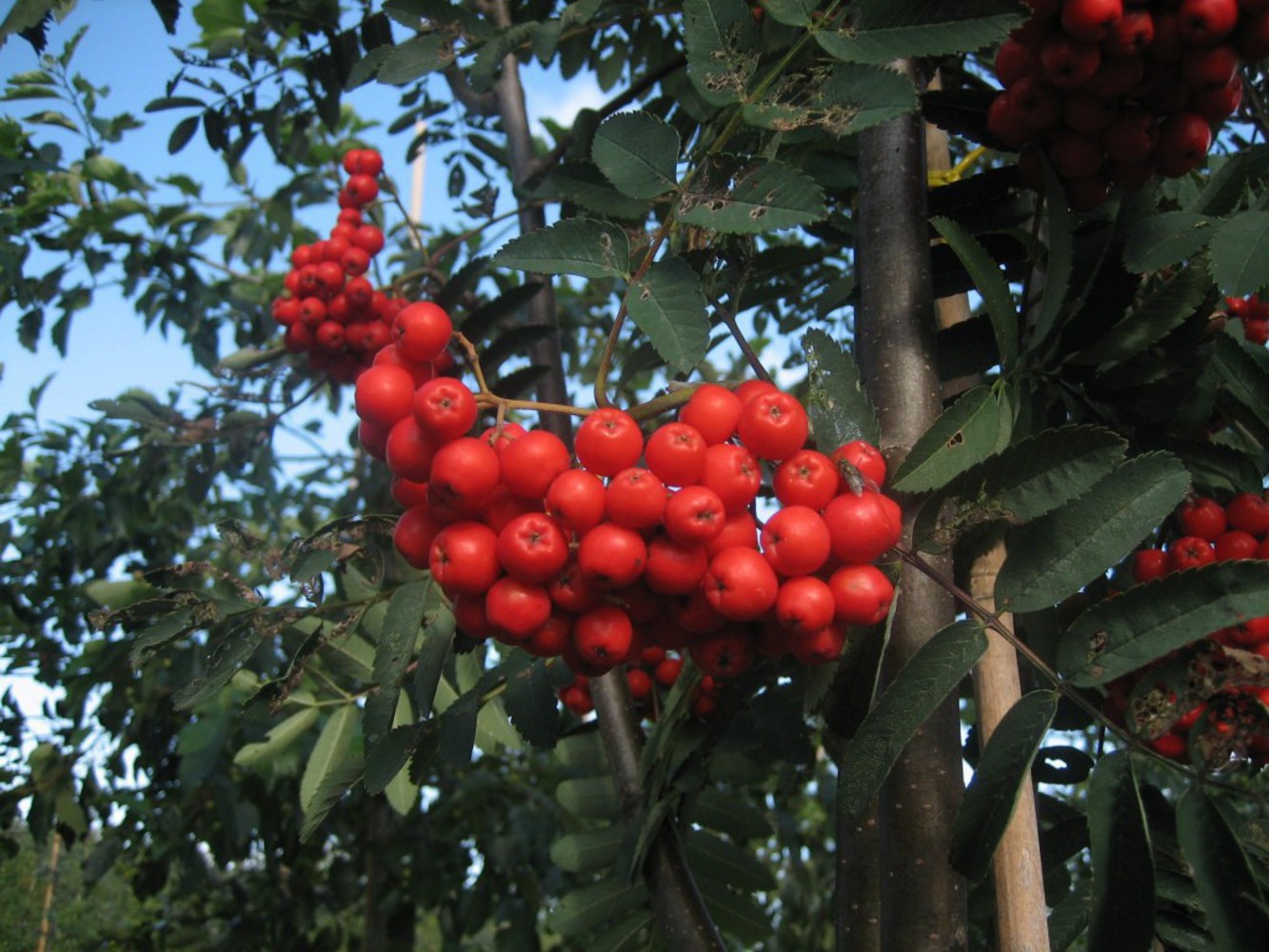 Рябина обыкновенная Эдулис (Sorbus aucuparia var. edulis) – удивительная красавица, привлекающая внимание стройным силуэтом кроны, ажурной листвой, крупными соцветиями и съедобными плодами оранжево-красного цвета. Принадлежит к семейству Розоцветные. Высота взрослого дерева достигает 10-15 м, диаметр 6 м. Крона густая, узкопирамидальной формы, с возрастом становится широкопирамидальной. Ветви вертикально растущие. Побеги и черешки красноватые. Листья непарноперистые, несколько темнее и больше чем у остальных рябин. Осенью они начинают приобретать оранжево-красные тона. Период цветения начинается в мае, цветки белые, очень ароматные, собраны в щитковидные соцветия до 20 см в диаметре. В августе-сентябре на дереве созревают кисти красных кисло-сладких ягод, которые долго остаются на ветвях. Растение обладает высокой зимостойкостью. К плодородию почв не сильно требовательно. Место для посадки лучше выбирать солнечное или полутень, так как в сильной тени дерево плохо цветет и перестает плодоносить. Не выдерживает городскую загазованность.Рябина «Эдулис» прекрасно демонстрирует свою декоративность в различных ландшафтных композициях.