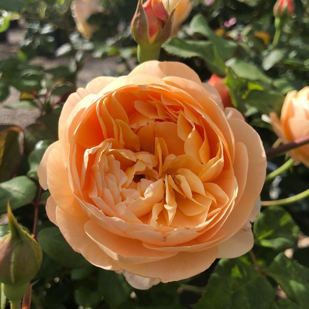 Роза английская «Роальд Даль» №406:o Окраска цветка: персиково-абрикосовыйo Форма бутона: розетковиднаяo Диаметр цветка: 6-8 смo Высотка растения: 110-120 смo Ширина растения: 90 смo Аромат: малины с нотками чаяo Необходимо укрытие на зиму (суровые зимы)