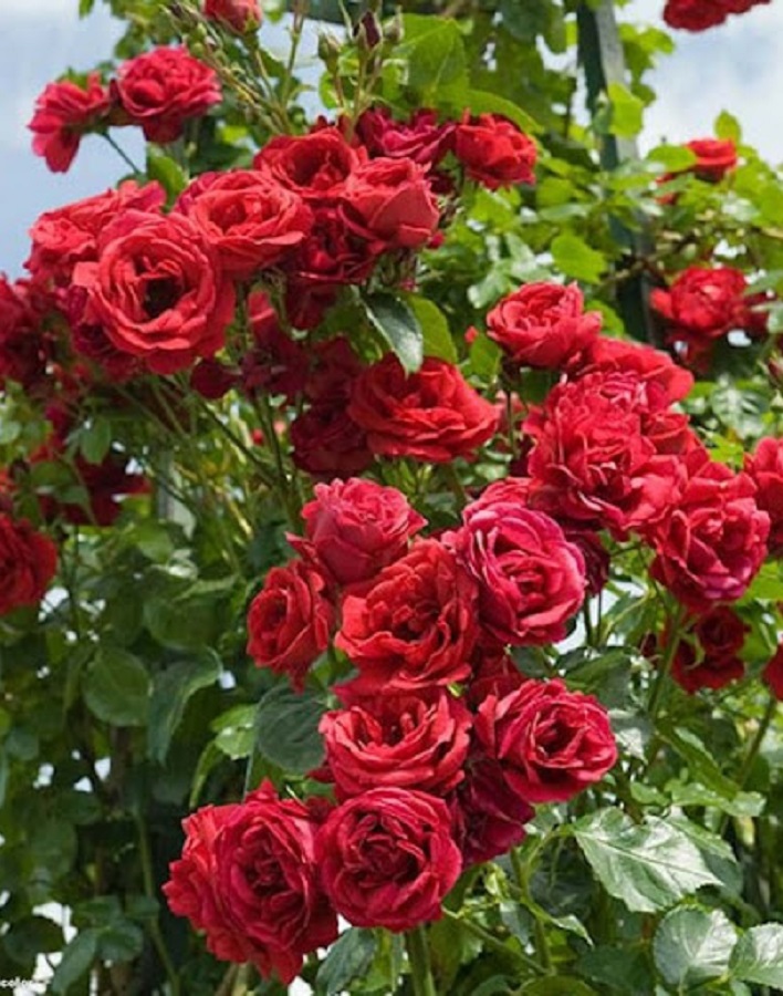 Роза плетистая «Симпатия» №54:o Окраска цветка: краснаяo Форма бутона: бокаловиднаяo Диаметр цветка: 7-9 смo Высотка растения: 100-250 смo Ширина растения: 200 смo Аромат: приятныйo Необходимо укрытие на зиму (суровые зимы)