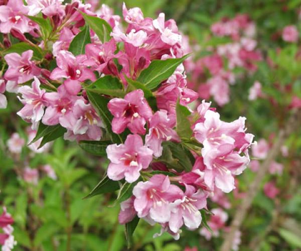 Вейгела цветущая (Стириака) – лиственный кустарник, выведенный при скрещивании других двух сортов вейгелы: корейской и обильноцветущей. Гибридные сорта всегда устойчивее и неприхотливее, чем дикорастущие, что сделала их намного популярнее среди отечественных садоводов. К гибридам относится и цветущая Styriaca. Представляет собой кустарник среднего размера с подушкообразной кроной, которая с возрастом разрастается, а благодаря многочисленным небольшим листьям, приобретает ажурную форму. Листва светло – зелёного цвета – является подходящим фоном для прекрасного двойного цветения вейгелы. Цветки колокольной формы, на свету становятся ярко – розовыми с красными и белыми переливами. Кустарник вейгелы отличается продолжительным цветением, распускается и радует своих владельцев около 20 дней. Станет одним из главных украшений любого пейзажа независимо от расположения растения на территории.